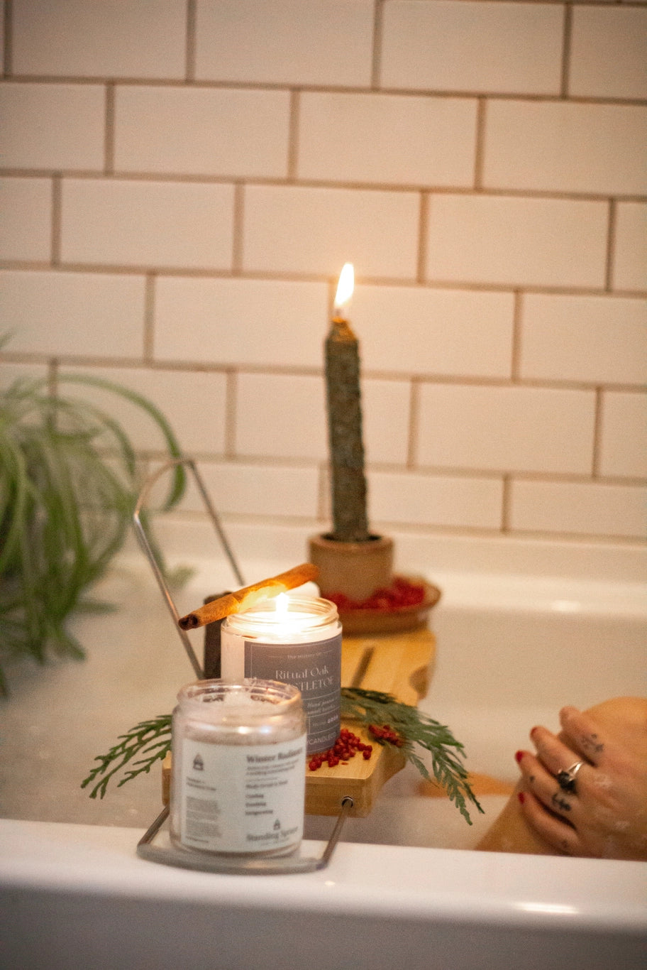 Each candle comes with a bay leaf for writing your simple goals and burning to its entirety with your ritual candle. 5.2 oz