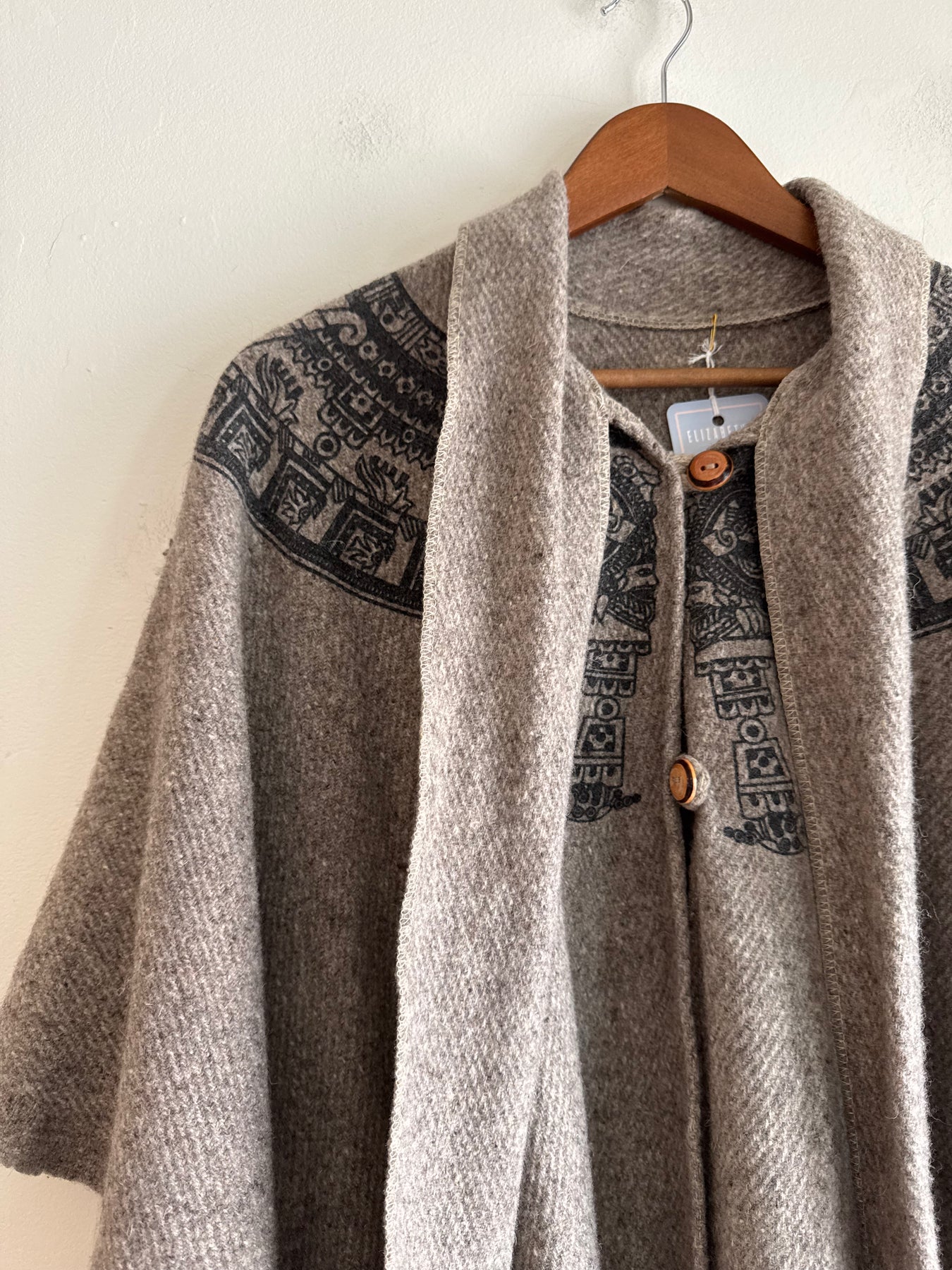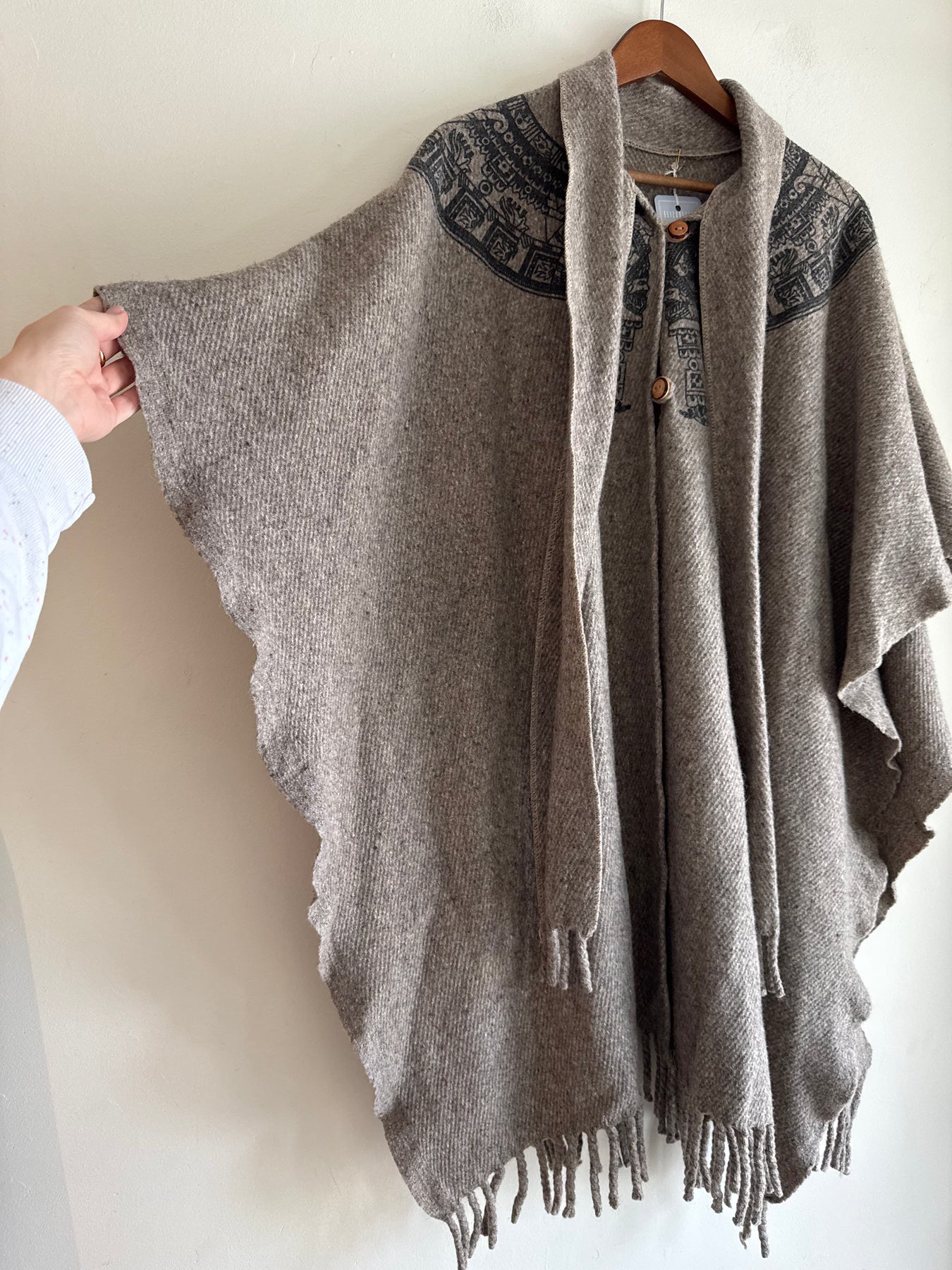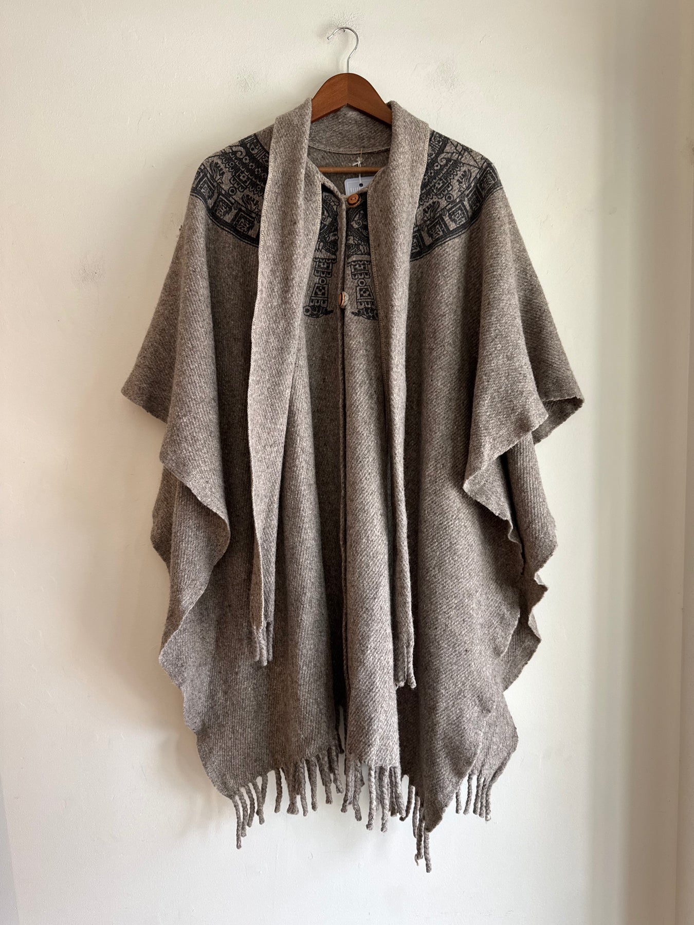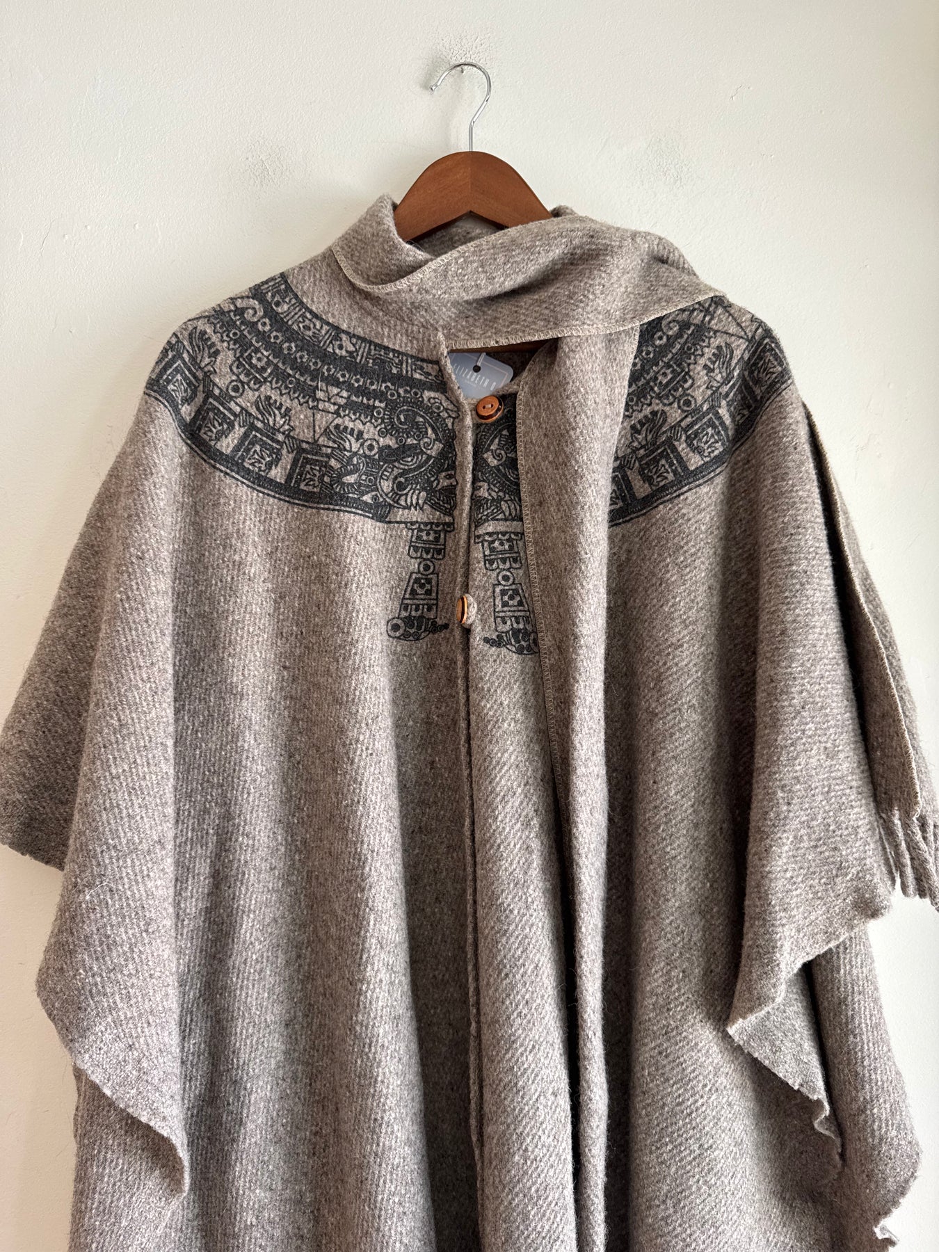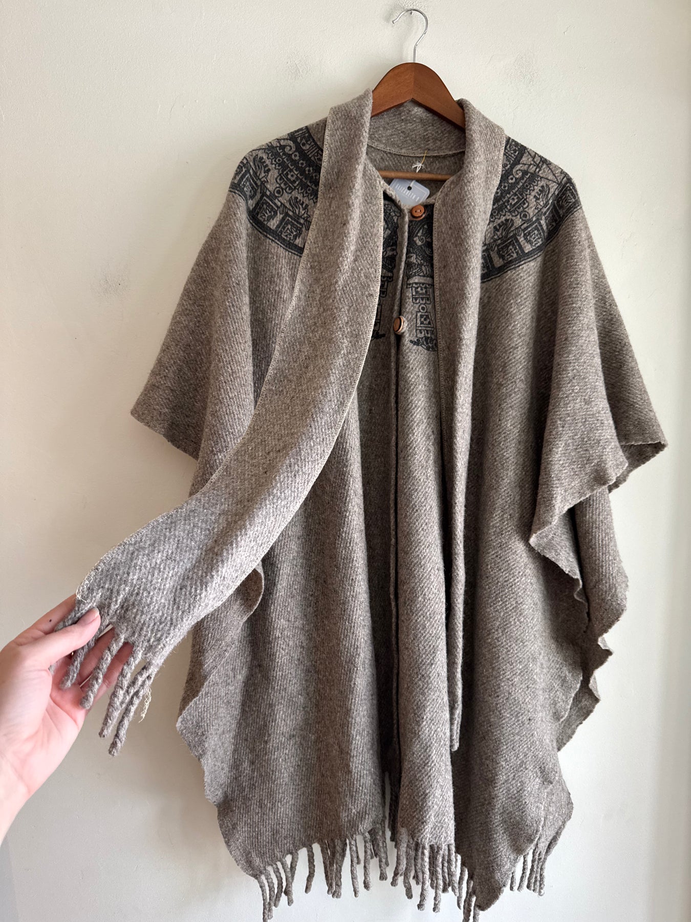 A open sized piece that will keep you warm. This Peruvian cape has 2 wooden buttons, a print that wraps around the yolk completely and has two long scarf pieces to wrap you up and keep you warm.