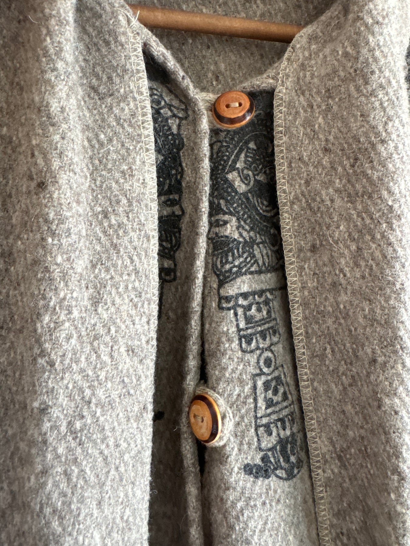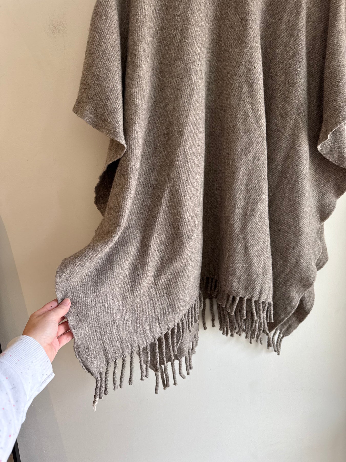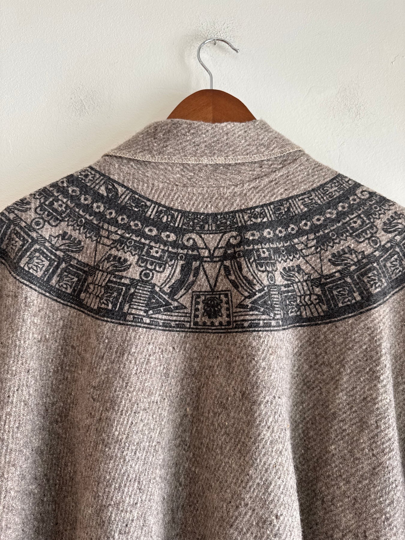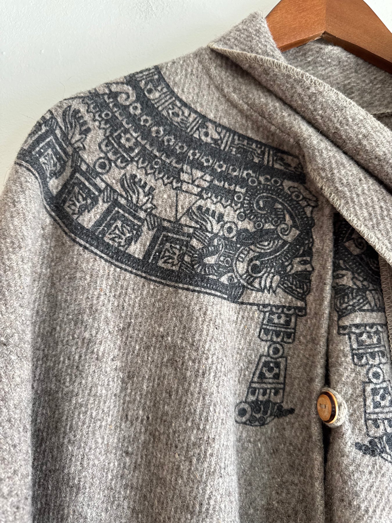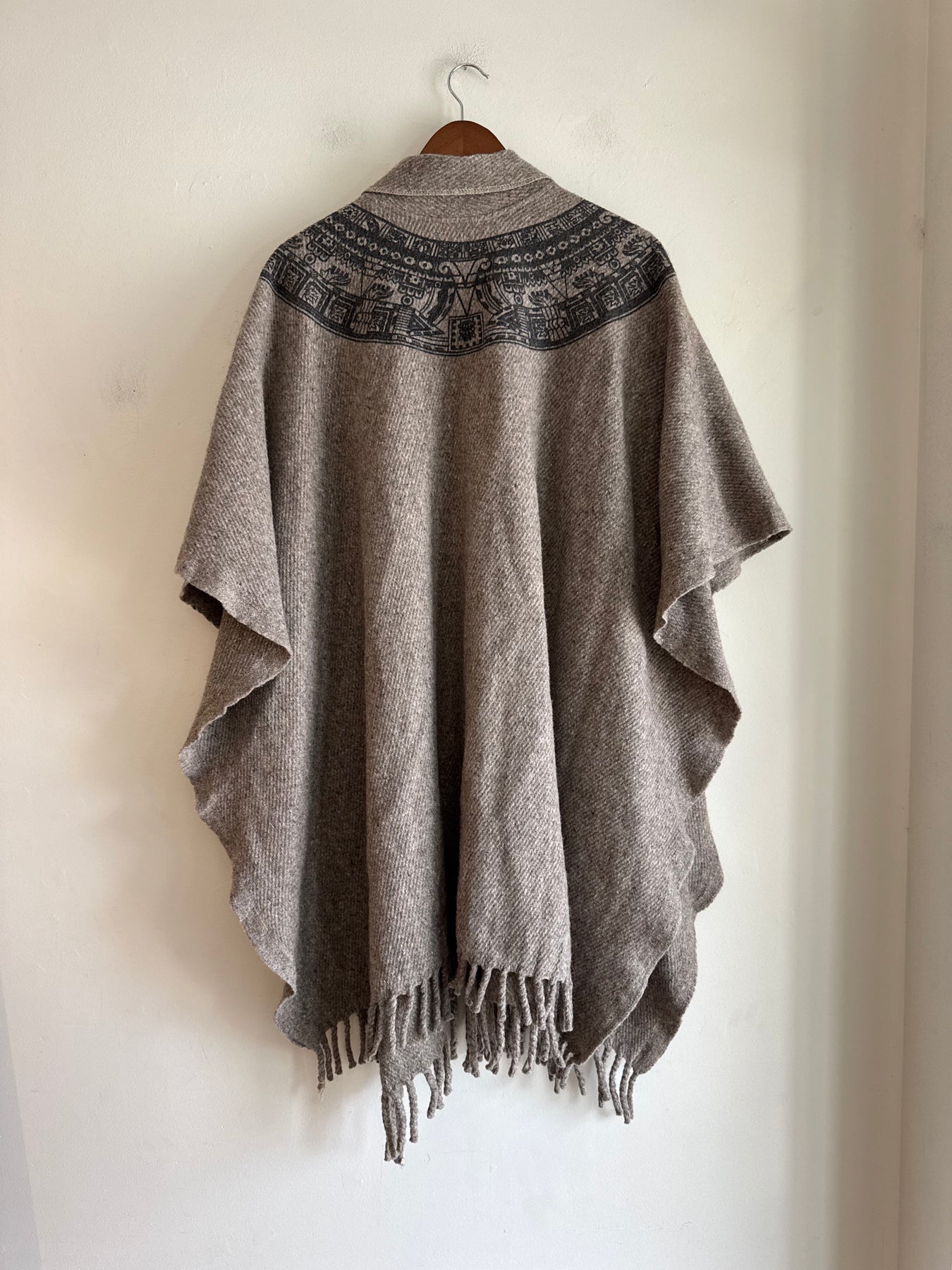 A open sized piece that will keep you warm. This Peruvian cape has 2 wooden buttons, a print that wraps around the yolk completely and has two long scarf pieces to wrap you up and keep you warm.